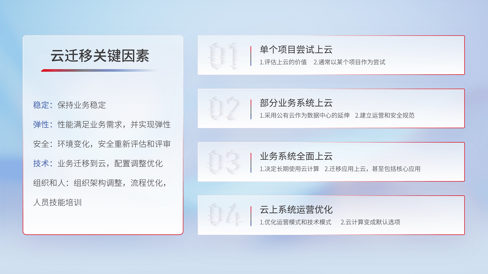结合实际业务,,从规划设计、、、云平台选型、、、云原生改造、、数据迁移、、、集成交付,,,迁移全过程为客户识别最佳上云路径,,,做好风险识别管理,,设计网络架构、、、身份权限、、、、安全审计合规、、、操作审计、、、、日志审计、、、、监控告警策略、、、、多站点容灾设计等,,对云上基础设施进行整体规划,,提升IT治理水平,,以满足弹性、、、高可用、、高性能的需求。。。