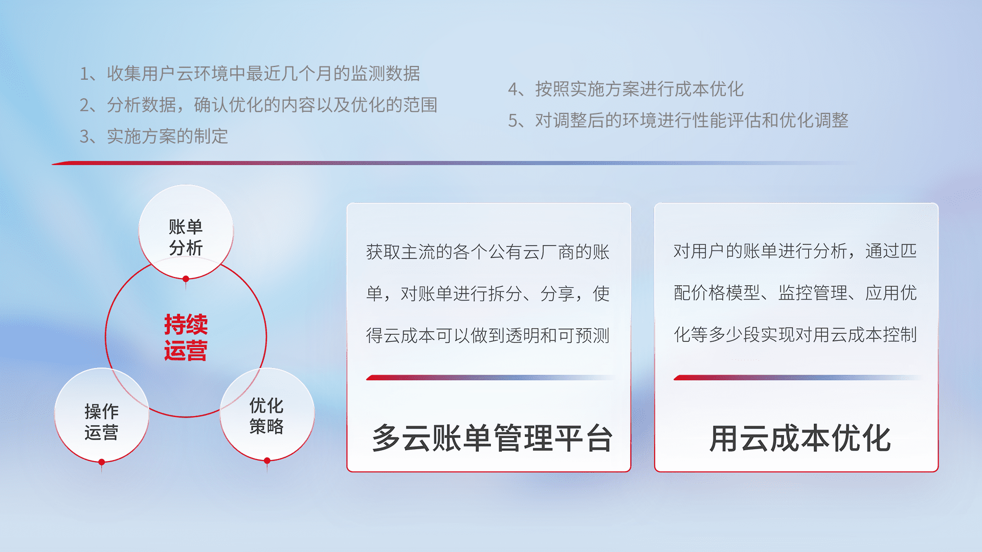 通过多云纳管,,以统一的资源数据模型把客户的云资源进行抽象和封装,,,,进而实现对多云资源的统一操作,,,保障云资源管理的可靠性、、稳定性与可用性。。量身定制化运维内容,,,,配置、、、开发运维、、、、补丁管理、、、备份、、监控、、、认证和访问管理、、、审计和日常巡检等,,,,保障在用云过程中的可靠度,,,,稳定度以及高可用率。。。。