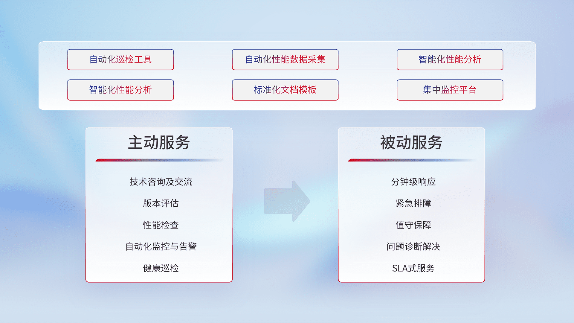 智能化工具和标准化文档,,保障服务质量,,提供主动服务(包含技术咨询、、、、版本评估、、、性能检查、、、自动化监控与告警、、健康巡检)和被动服务包含(分钟级响应、、、、紧急排障、、、值守保障、、、问题诊断解决、、、、SLA服务)。。。。